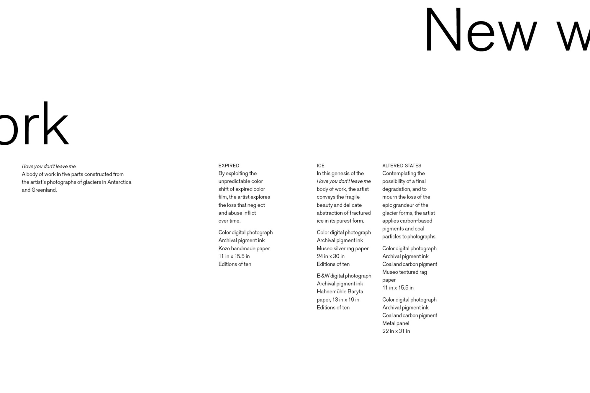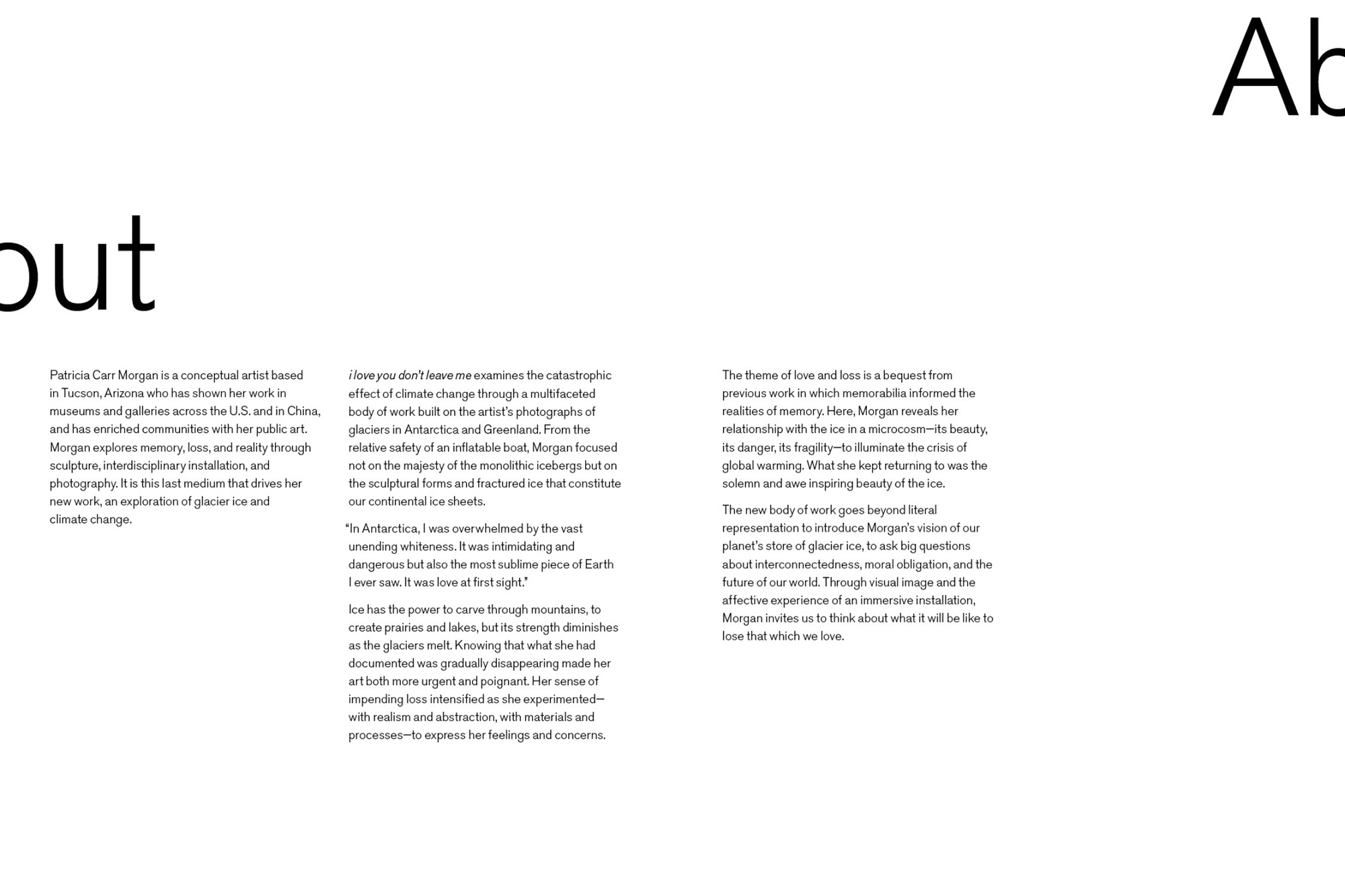 Patricia Carr Morgan is a conceptual artist who has shown her work in museums and galleries across the world, and has enriched communities with her public art. Morgan explores memory, loss, and reality through sculpture, interdisciplinary installation, and photography. It is this last medium that drives her new work, an exploration of glacial ice and climate change. The theme of love and loss is a bequest from previous work in which memorabilia informed the realities of memory. Here, Morgan’s work asks big questions about interconnectedness, moral obligation, and the future of our world.